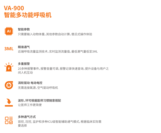 VA-900 智能多功能呼吸机,以智能简化操作,以精准保障治疗,以灵活适应需求,用科技力量为医师减负,为动物诊疗事业赋能。选择 VA-900,让呼吸支持更精准、更安全、更高效。